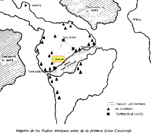 A partir dessas três cidades, teriam sido fundadas 26 cidades de pedra, incluindo Humbaya e Patite (Paitíti ?) na Bolívia, Emin, nas zonas baixas do Grande Rio e Cadira (Candire ?)nas montanhas da Venezuela. Mas “todas foram completamente destruídas na primeira Grande Catástrofe, 13 anos depois da partida dos Deuses.”