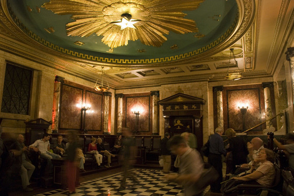 Então, as coisas tornam-se extremamente maçônicas. O fundo inteiro atrás de MJ se transforma em um quadriculado preto e branco – usado no chão ritualístico das lojas maçônicas.Na verdade, toda o palco é basicamente uma grande loja maçônica, com dois pilares (formado por peças de xadrez), um arco acima deles e quadriculados. Tudo isso é cercado de “estrelas flamejantes”.A loja maçônica em Andaz Hotel, em Londres. Piso quadriculado, pilares e uma estrela flamejante gigante no teto.Muitos dos símbolos encontrados nesta imagem maçônica são encontrados na “performance”.