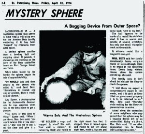 O Jornal local de Jacksonville ficou intrigado com a história, tanto que eles enviaram um fotógrafo experiente, Lon Enger, para tirar algumas fotos. O cético Enger aceitou respeitosamente a tarefa, mas secretamente temia tratar-se de uma família maluca e pensava em não fazer o serviço. Quando Enger chegou à casa da família Betz, ele foi recebido ansiosamente por Gerri que não perdeu tempo em apresentar-lhe a esfera. Enger descreveu o momento no dia 12 de abril de 1974, na edição do jornal St. Petersburg Times: “Eu estava desconfiado desse tipo de coisa. Quando cheguei lá, a Sra. Betz disse: ‘você não vai acreditar se você não vê-lo .” Foi quando a matriarca da família Betz instruiu o fotógrafo ainda duvidoso, a dar um pequeno empurrão na bola no chão. Lon Enger assim o fez, e para ele nada de mais aconteceu pois a bola simplesmente parou quando terminou a força do impulso que ele havia dado a esfera. Mas de repente a bola rolou mais uns tantos metros e parou mais uma vez. Em seguida, ela voltou e rolou para a esquerda cerca de oito metros, fez um grande arco e voltou logo para os pés do fotógrafo. Enger examinou a esfera de aço com atenção e, como a família Betz fez antes dele, não foi possível encontrar marcas ou indicação de um fabricante na superfície, apenas o símbolo triangular inescrutável estampado em sua lateral. Assim que o fotógrafo convertido retransmitiu a história fantástica para seu editor, o jornal não perdeu tempo em publicar o relato, e dentro de dias o caso estourou na mídia em diferentes partes do mundo.
