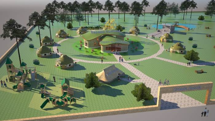 Uma cidade escola, onde todos podem ter contato com conceitos de cooperação e auto sustentabilidade. Espaços feitos com técnicas de bio construção, reutilização de água da chuva, e energia renovável.