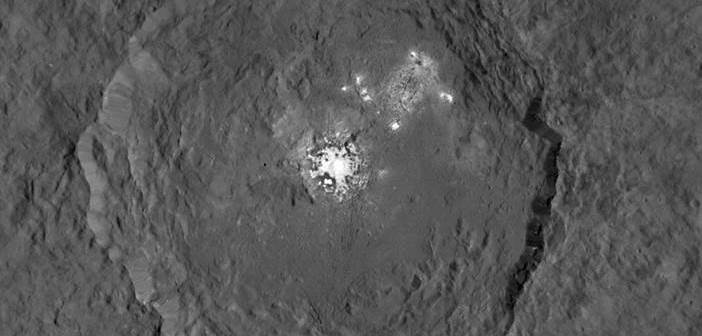 A primeira suposição era de que as manchas eram gelo , mas os comprimentos de onda de luz que elas estão refletindo não combinam muito bem. A Dawn, desde então, entrou na órbita de Ceres e registrou imagens muito mais detalhadas da superfície fascinante do planeta-anão. Mas cada imagem traz mais perguntas do que respostas.