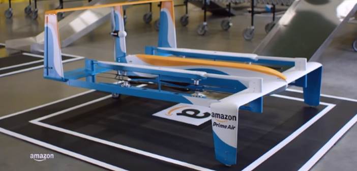 Amazon Prime Air é um serviço que está em fase final de testes e promete entregar pedidos em até meia hora através de um drone que carrega o pacote com a compra, avisa o cliente sobre a proximidade do destino e, baseado em uma marca colocada pelo cliente no chão, aterrissa, deixa o pacote e vai embora.