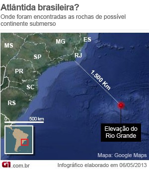 Geólogos brasileiros anunciaram nesta segunda-feira (06/05/2015) que foram encontrados, a 1.500 km da costa do Rio de Janeiro, indícios de que estaria ali um pedaço de continente que submergiu durante a separação da África e da América do Sul, época em que surgiu o Oceano Atlântico.