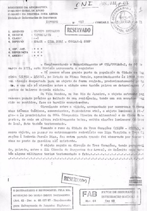 Um documento do Ministério da Aeronáutica mostra que Varginha (MG), conhecida como a “Terra do ET”, pode ter sido visitada por seres de outro planeta muito antes do famoso caso de 1996. Conforme o documento, há registro de moradores que disseram ter visto um Objeto Voador Não Identificado (OVNI) na cidade em 1971. Durante 46 anos, o documento ficou guardado sob sigilo nos arquivos do governo e só na semana passada foi divulgado pelo Arquivo Nacional.