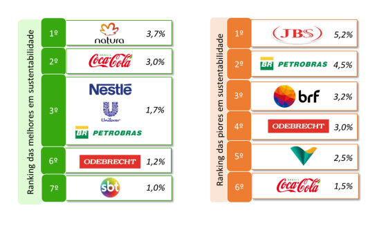 Essa maioria de empresas não brasileiras no topo da liderança de sustentabilidade é também um fato novo em 12 anos do levantamento e aponta uma dissociação entre sustentabilidade e capitalismo nacional na cabeça dos consumidores. Os gigantes da economia local envolvidos em escândalos e que ocuparam as manchetes nacionais como JBS, BRF, Odebrecht e Petrobras foram automaticamente associadas às piores práticas de responsabilidade corporativa.