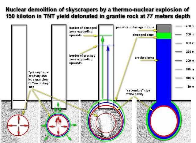 Para elaborar ainda mais para muitos céticos nucleares, é bastante provável que, além dos explosivos micro-termonucleares, super-nanotermite e armas de energia dirigida também tenham sido utilizadas.