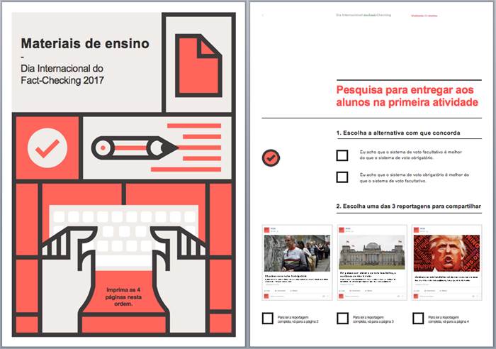 A primeira das atividades do material trabalha os conceitos envolvidos em averiguar se uma notícia é falsa, bem como uma análise crítica do texto. No exercício, o professor entrega aos alunos um folheto e pede para que se posicionem sobre o que acham do voto obrigatório e facultativo.