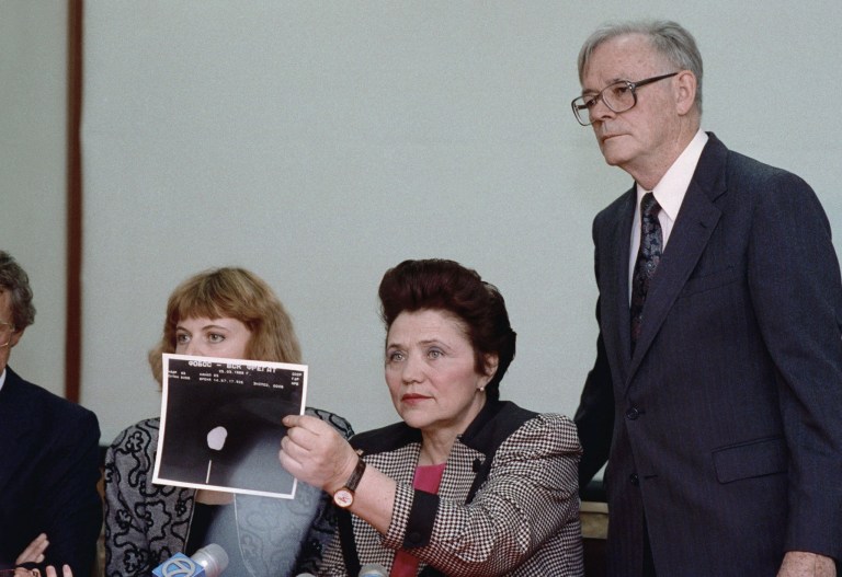 Os visualizadores remotos não são os únicos que falaram de um incidente desse tipo. Em 1991, uma coronel aposentado da Força Aérea Soviética e aspirante a cosmonauta Marina Popovic, na foto à direita, expressou que uma das últimas fotografias recebidas pelos russos da Phobos II mostrou “a silhueta de um objeto de formato estranho se aproximando da espaçonave”. Popovich disse que a foto foi tirada em 25 de março de 1989, no espaço profundo perto de Fobos (lua de Marte), pouco antes do contato com a nave se perder. Ela disse que o objeto pode muito bem ter sido uma espaçonave alienígena. Sua crença de que isso aconteceu também reportada de forma muito breve pelo The New York Times.
