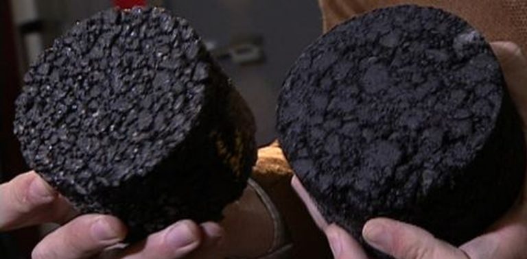 O asfalto absorvente é feito com pedras maiores, para que haja vazios entre elas. O projeto prevê até 25% de espaço para a água infiltrar. Lado a lado com uma amostra de asfalto comum, a diferença é visível. O convencional é mais compacto, praticamente não há espaço entre as pedras.