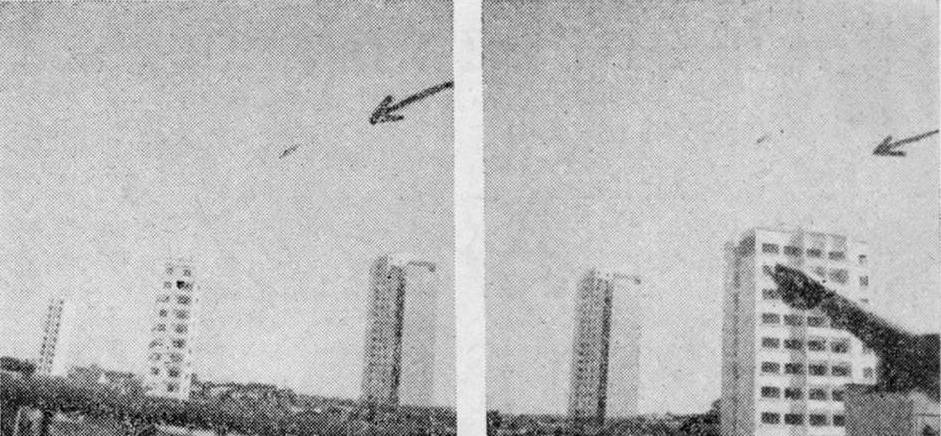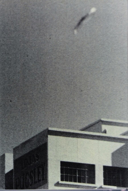 Única fotografia com qualidade de um dos discos voadores sobre Curitiba, obtida em 14 de dezembro de 1954. O prédio observado na imagem é o Edifício Pugley, situado na esquina da Marechal Deodoro com Monsenhor Celso, no centro de Curitiba.