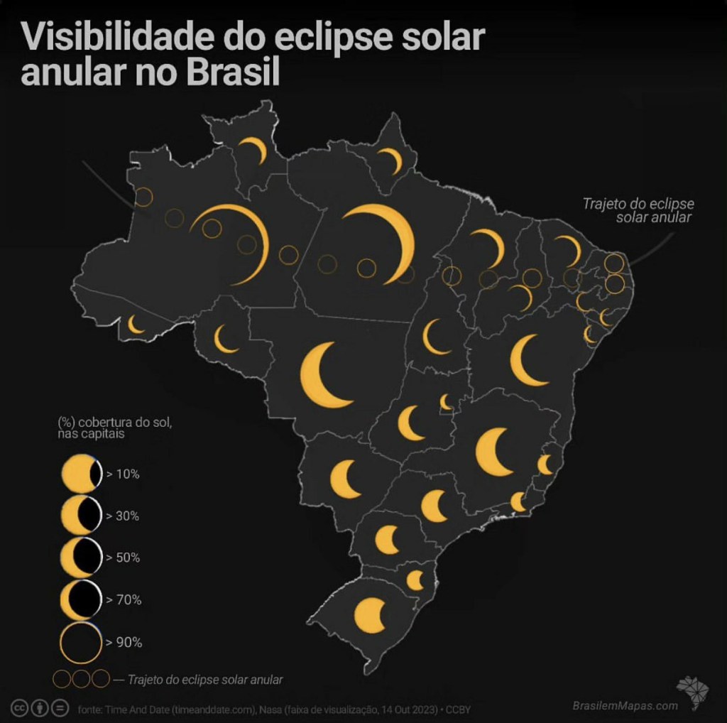 Aqueles que estiverem nos estados do Amazonas, Pará, Tocantins, Maranhão, Piauí, Ceará, Rio Grande do Norte, Paraíba e Pernambuco poderão apreciar o eclipse anular. No restante do país, o fenômeno poderá ser visto como parcial.